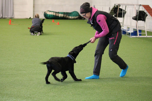 Lopuksi katsottin maahanmenoa venyytyksen kautta. Eli Simo istumaan, yritin saada "kurre-asentoon" ja siitä nopeasti maahan. Pari kertaa meni melkein, mutta vielä on pikkkupennulla lonkat niin löysät ettei ihan tasapaino kestänyt. Mutta hyvä alku ja vahvistamme lihaksia kotona. Muuten olen kyllä niin tyytyväinen tuon pennun tekemiseen! Luulen, että hänestä tulee oiva harrastuskaveri ja iloa ja innostusta löytyy. Saa nähdä mitä tyypistä kasvaa mutta tällä hetkellä flatinalku sopii kuin hanska käteen ja niin tykkään sen tekemisestä!
